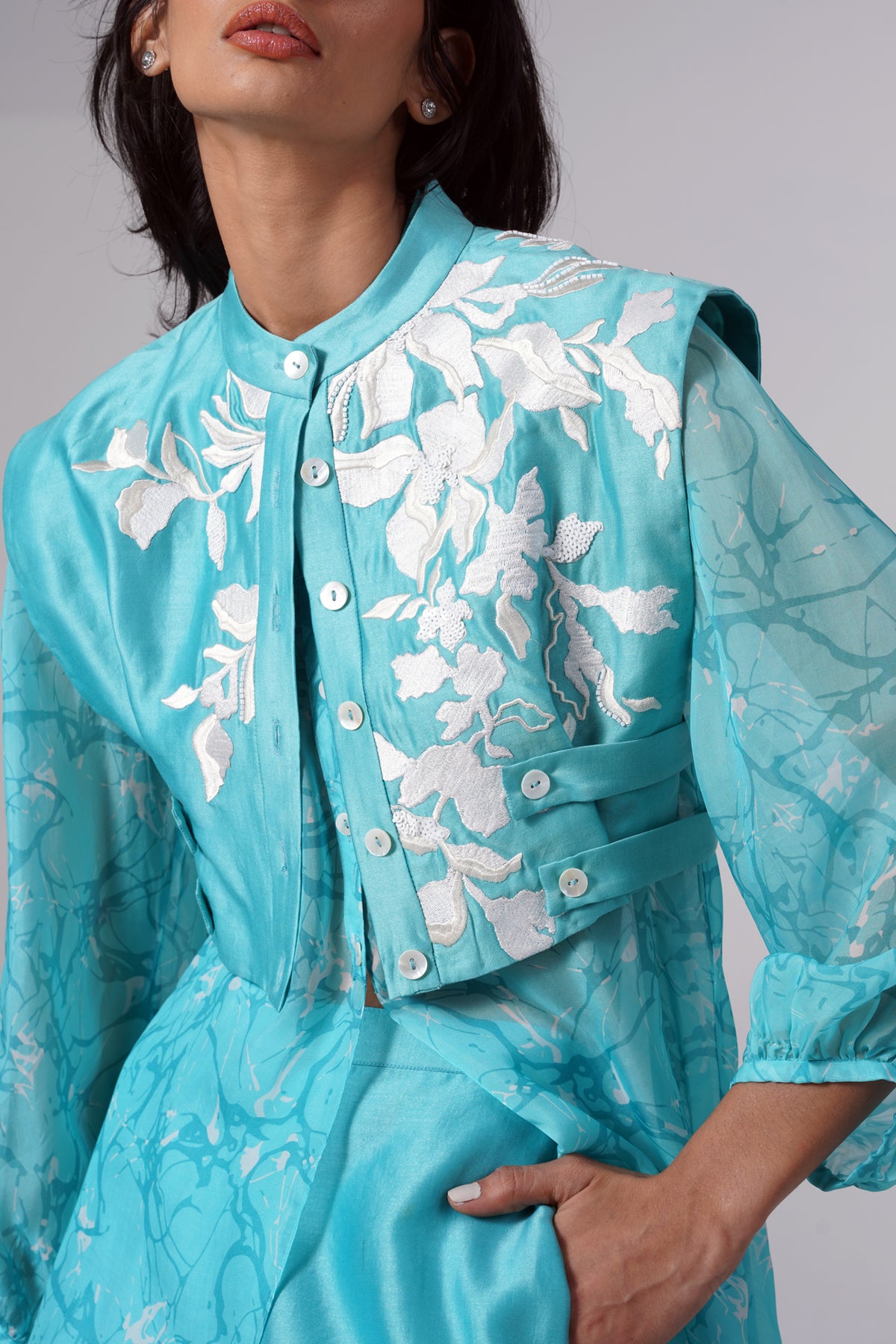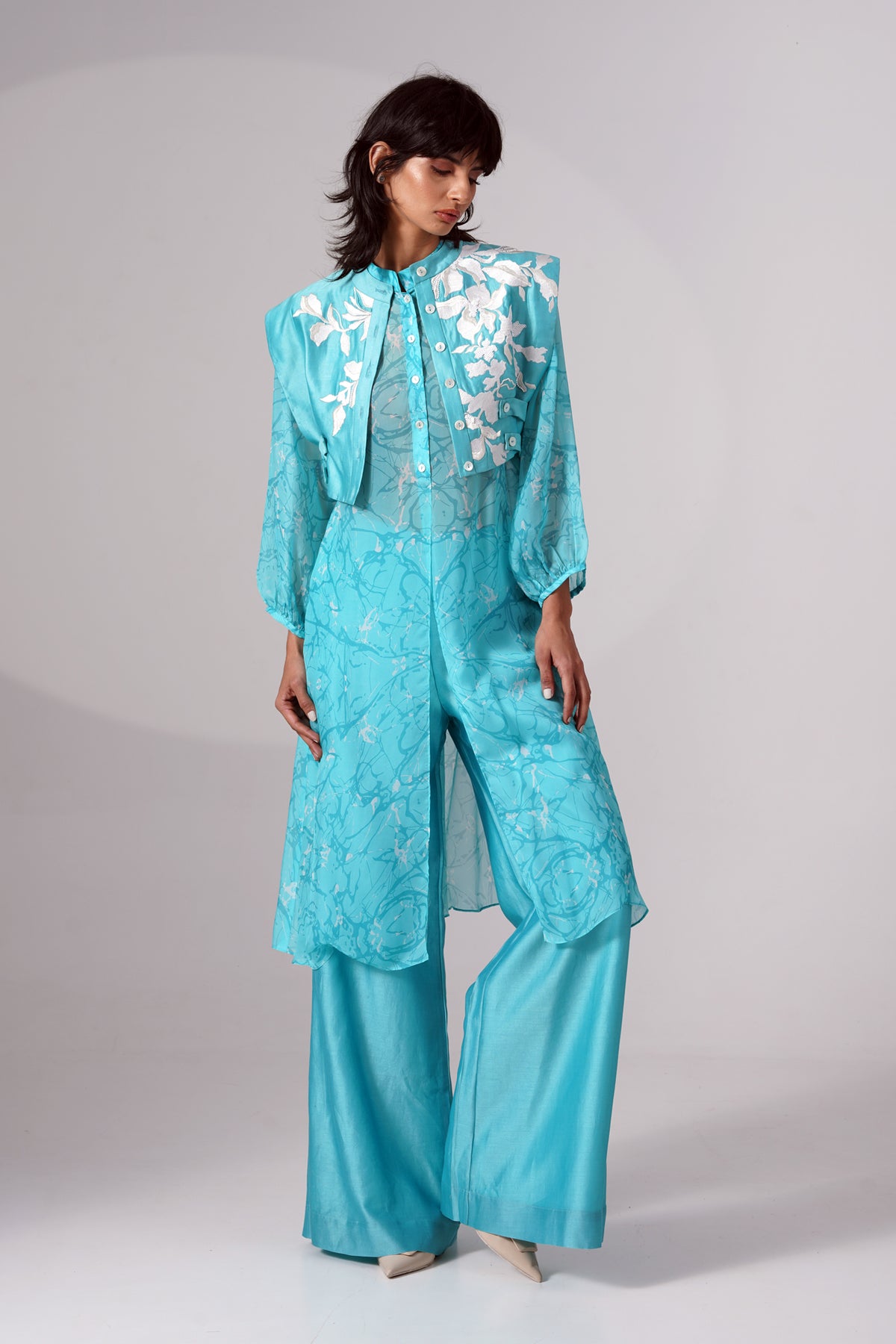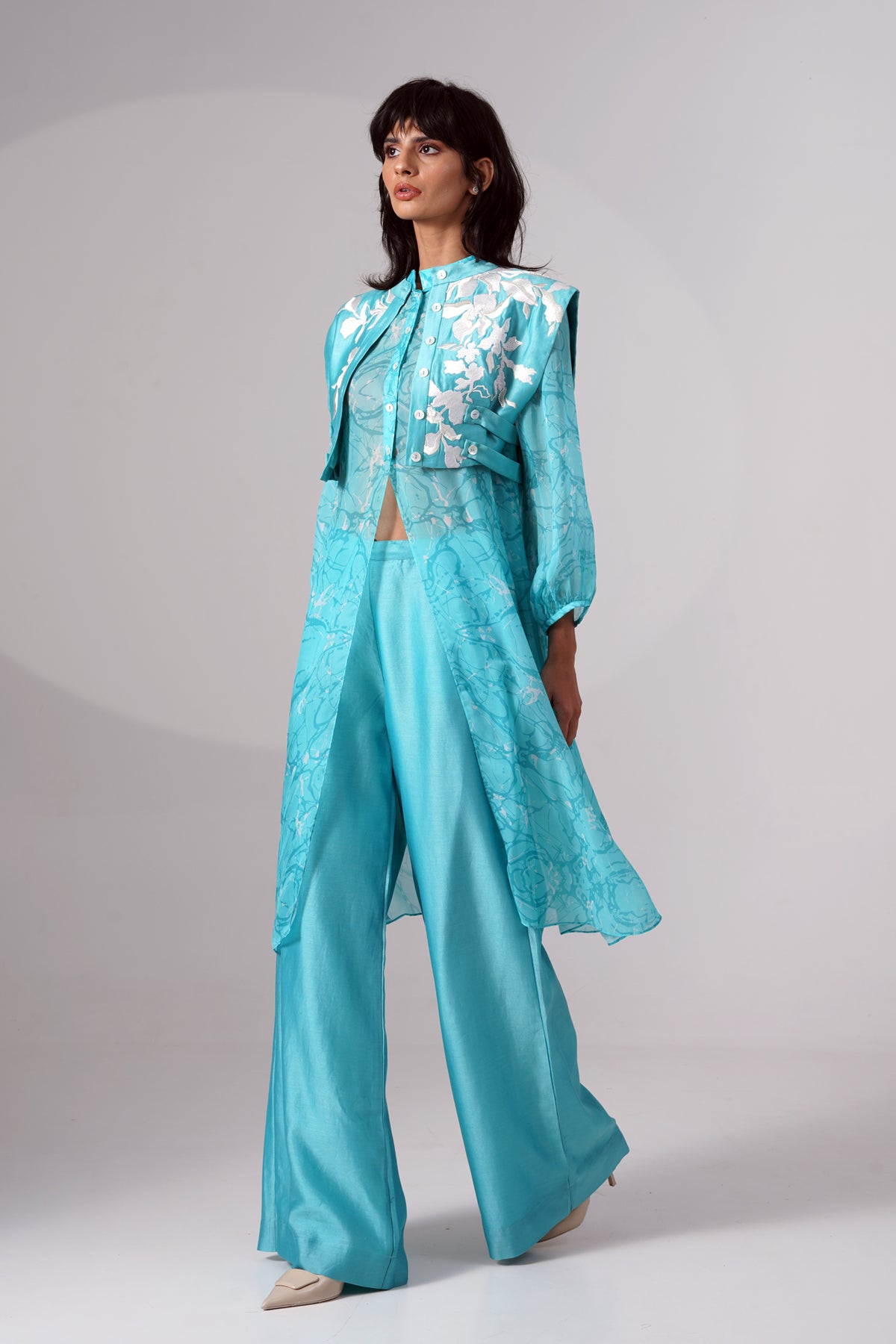 Introducing Lana, the ultimate in luxury fashion. This set includes a crop jacket, long shirt, and flared pants, all designed with exquisite attention to detail. Elevate your style with this sophisticated and exclusive set, perfect for any occasion.