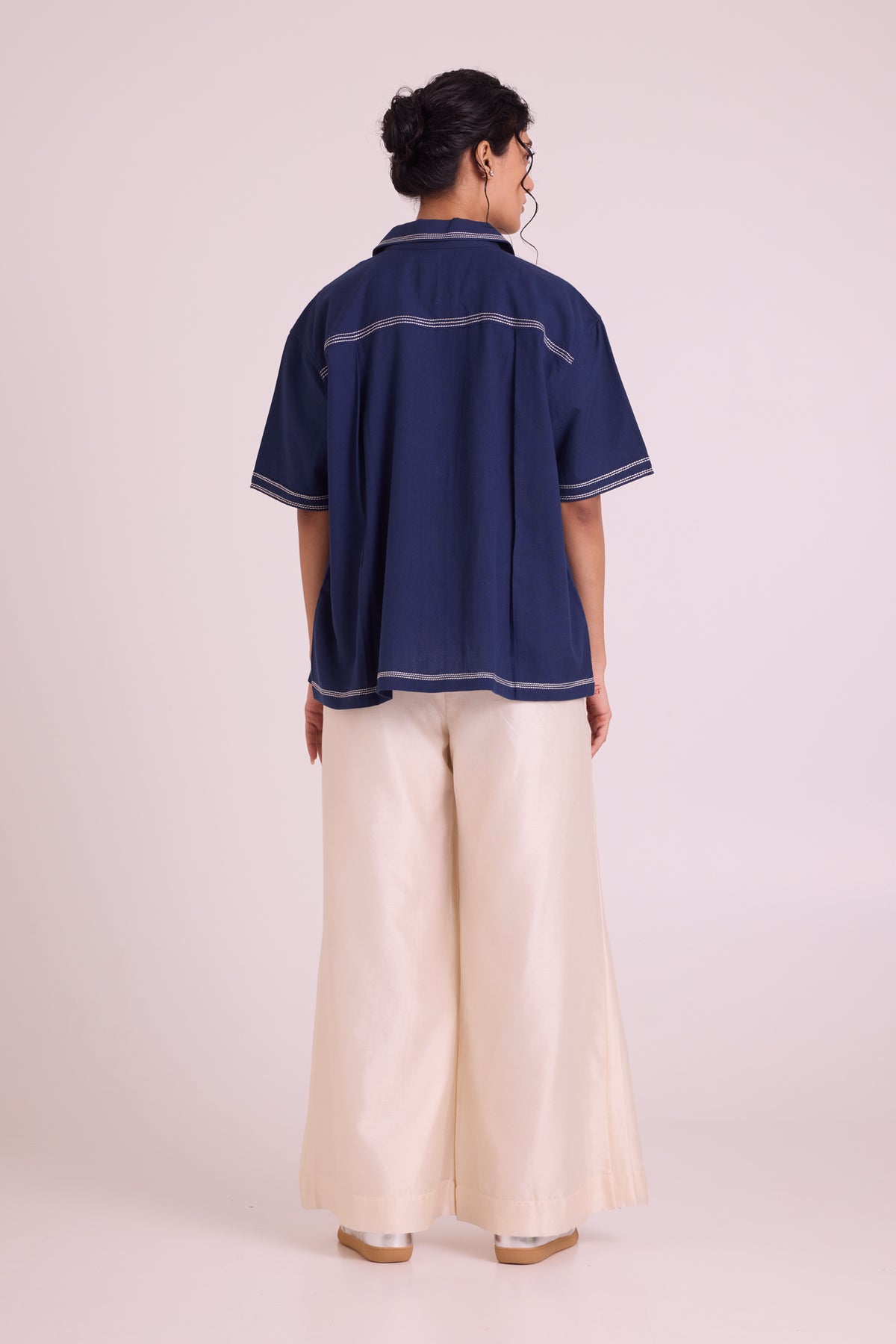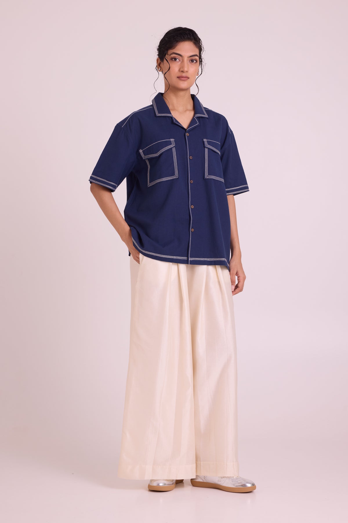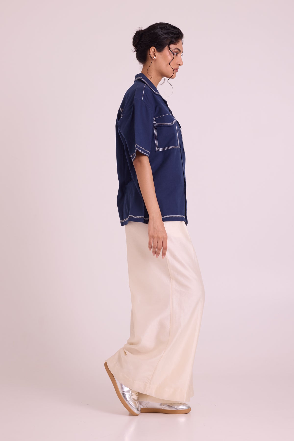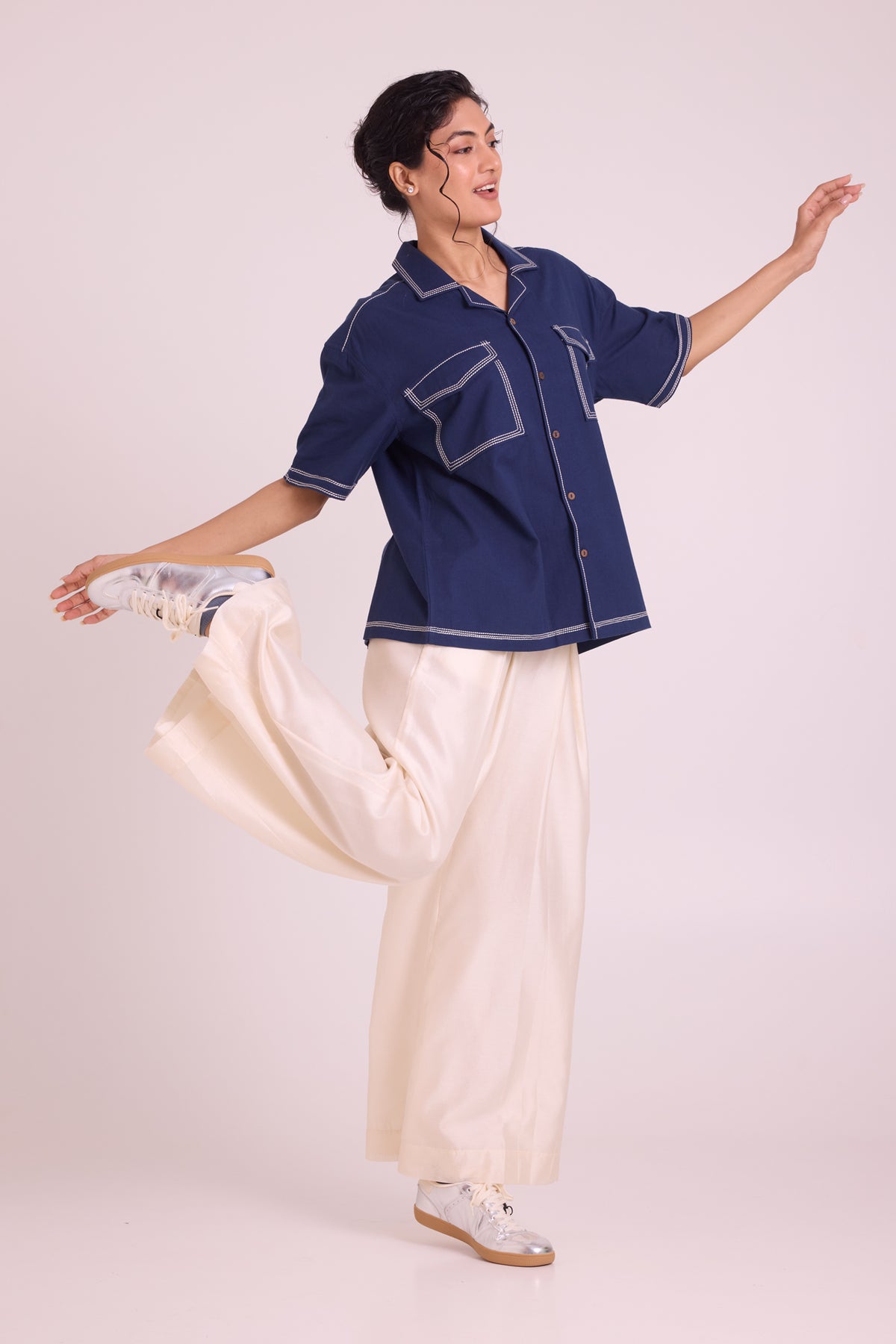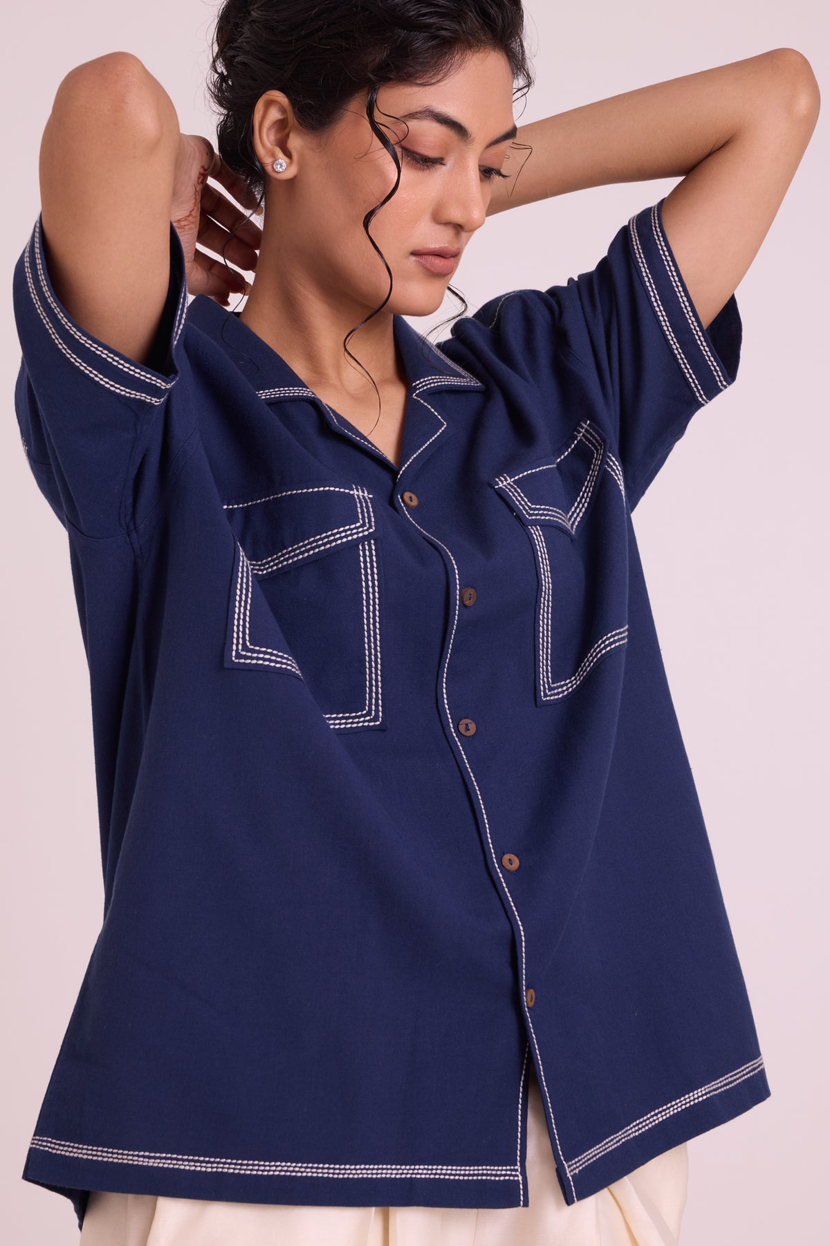 Manil doesn't do loud. It doesn't do frills. It's just indigo - calm, collected, and cooler than it lets on. The kind of shirt that reads books with spines, makes strong eye contact, and leaves group chats on purpose.