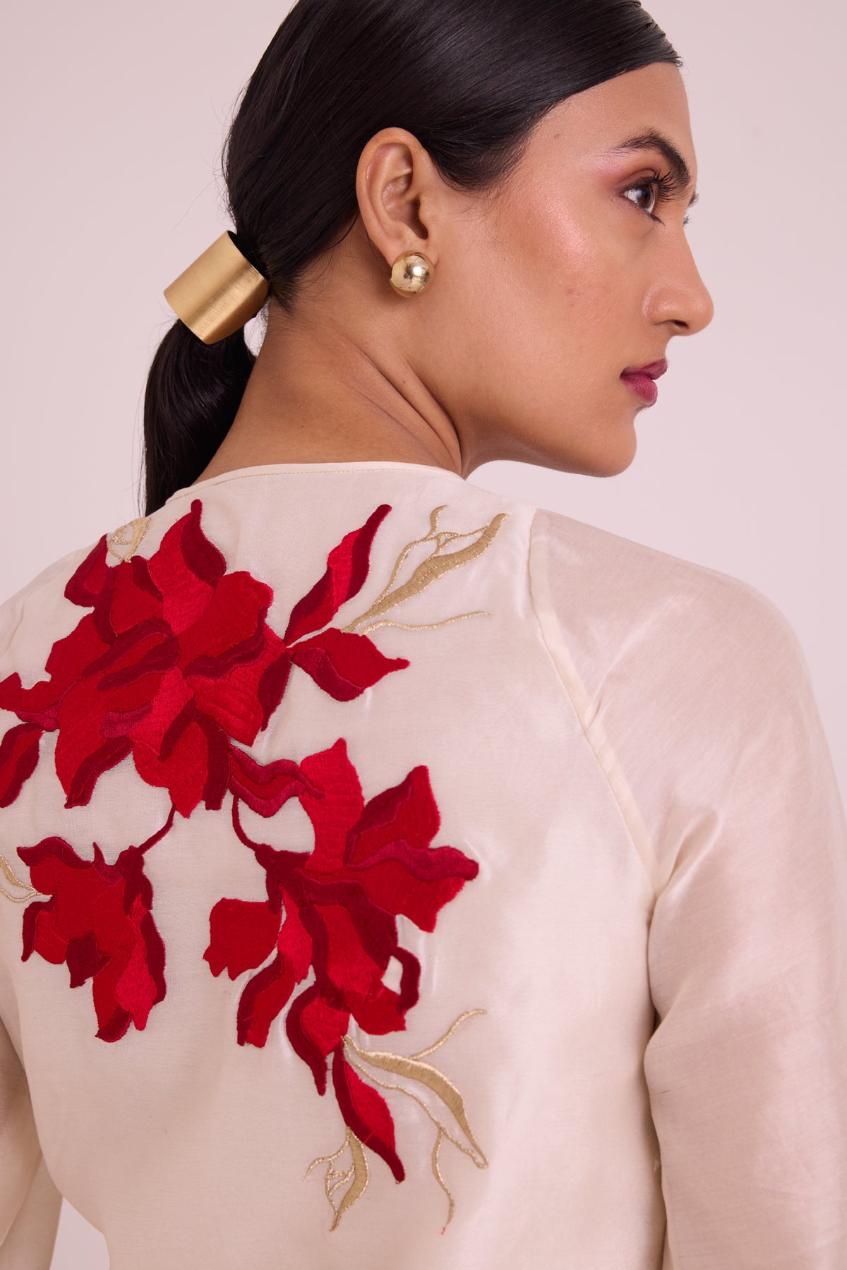 A dance of contrast and ease — the Malaca set pairs a fluid ivory top splashed with bold red florals against rich crimson wide-leg pants. The relaxed tie neckline and airy silhouette whisper sophistication, while the embroidery speaks confidence. Elegant, effortless, and made for modern celebrations.